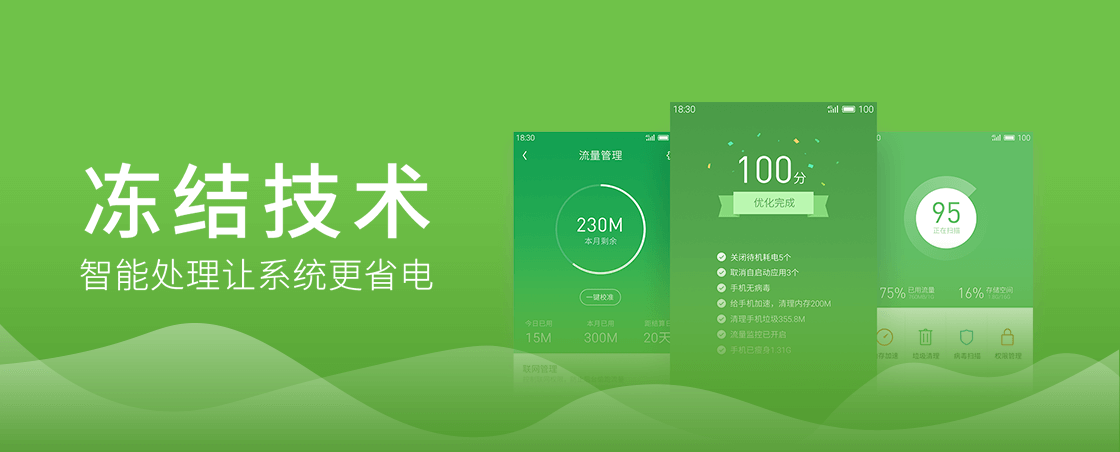 为了打造更省电的系统,Flyme 手机管家在原有「待机耗电管理」功能上加入「冻结技术」,进一步减少待机状态下的电量消耗,增强续航能力。